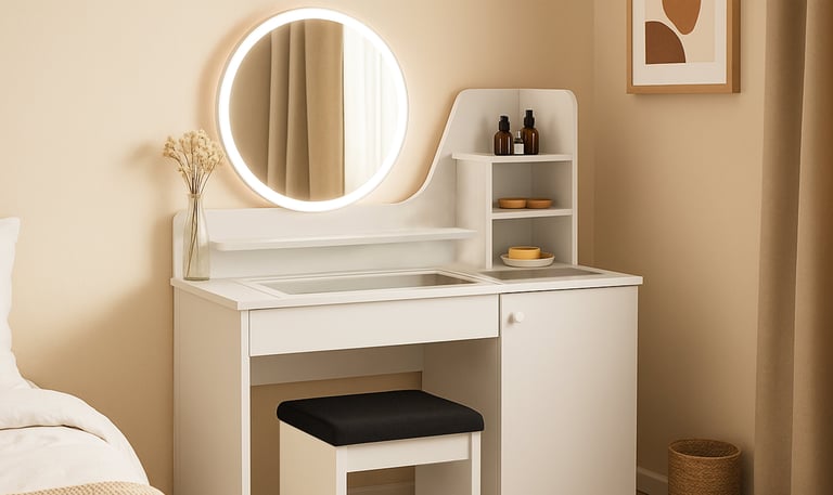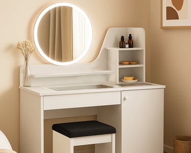 Meja Rias SHUMO memadukan fungsi dan estetika untuk area rias pribadi Anda. Setiap produk dilengkapi dengan cermin berkualitas dan sejumlah laci penyimpanan, memudahkan penataan produk kecantikan dan aksesori. Konstruksi kayu atau bahan MDF berkualitas tinggi memberikan kesan mewah sekaligus menjamin ketahanan jangka panjang.